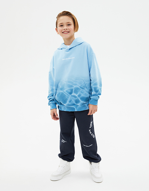 Худи небесно-голубого оттенка для мальчика. Модель прямого объёмного силуэта. Спущенная линия плеча. Глубокий капюшон. Карман-кенгуру. Манжеты и низ изделия из рибаны. Худи из футера с бархатистым эффектом. Изделие декорировано дизайнерским принтом.