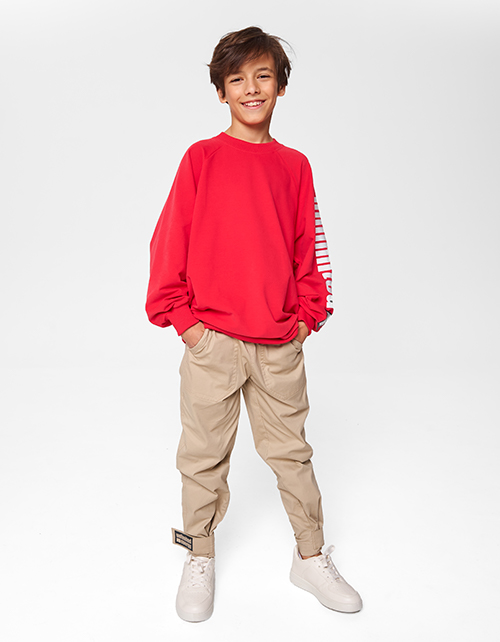 Красный oversize-свитшот для мальчика станет отличной основой джля образа. Модель декорирована тематическим принтом-надписью.
