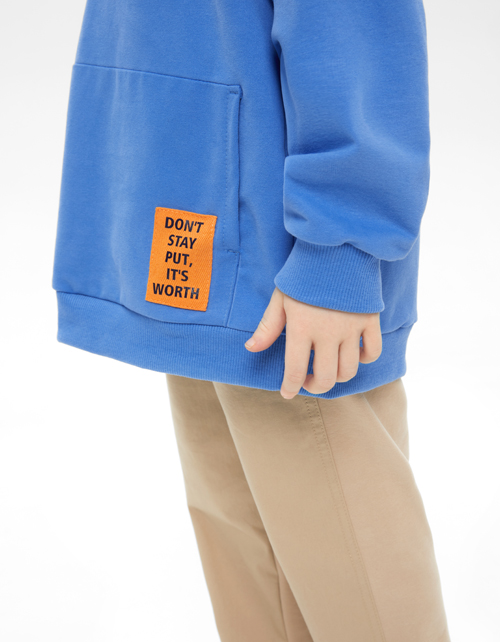 Лазурное худи для мальчика. Прямая модель со спущенной линией плеча. Джемпер с капюшоном и скрытым карманом-кенгуру декорирован контрастной лейбой. Худи выполнено из футера с браш-эффектом, что делает его мягким и бархатистым, повышая износостойкость.