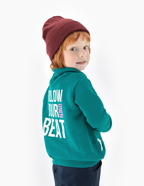 Джемпер свободного силуэта из футера малахитового цвета. Длинный рукав, спущенная линия плеча, воротник-хомут. Низ изделия и манжеты отделаны рибаной. Декорирован вышивкой на киперной тесьме и термотрансферной печатью