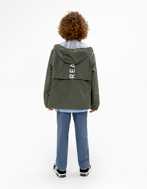 Ветровка оттенка хаки для мальчика. Модель прямого силуэта. Глубокий капюшон с регулировкой. Современная фактурная дышащая курточная ткань. Водо- и грязеотталкивающая пропитки. Контрастная подкладка из сетки. Манжеты на резинке. Авторская нашивка-лейбл.