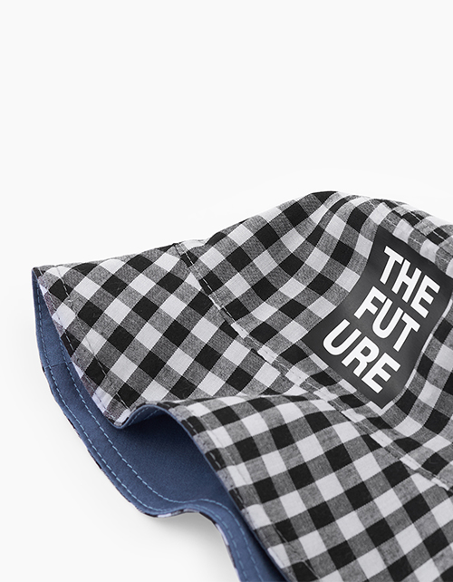 Двусторонняя панама для мальчика. Стороны: клетчатая сорочечная ткань и твил в оттенке деним. Изделие декорировано акцентными шрифтовыми принтами. Панама подойдёт к любому летнему образу.