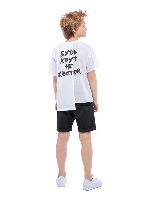 Черные шорты для мальчика на мягком поясе со шнурком свободной формы с двумя карманами-хулиганами. Низ с отворотами. Оформление в стилистике капсулы "Планета А".