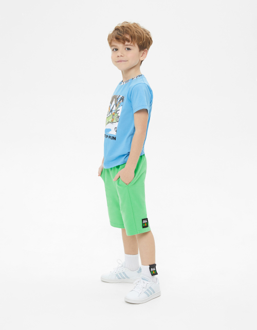 Яркие летне-зелёные шорты для мальчика. Удобная модель прямого силуэта со средней посадкой. Изделие из футера с браш-эффектом на мягком поясе декорировано вышивкой.