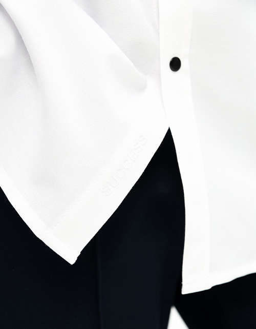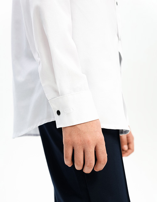 Белая рубашка прямого силуэта с длинным рукавом для мальчика. Приспущенная линия плеча. Защипы на спинке. Манжеты дополнены лаконичной авторской вышивкой. Рубашка с объёмным лаконичным карманом, как элементом утилитарного стиля.