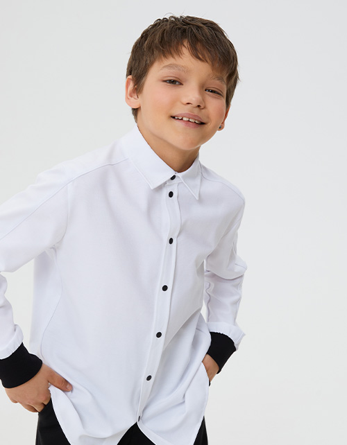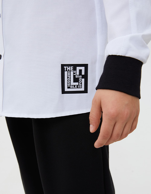 Белая рубашка прямого силуэта с длинным рукавом для мальчика. Спущенная линия плеча. Контрастные кнопки и манжеты из рибаны. Комбинация материалов: кулирная гладь и сорочечная ткань. Деликатный авторский принт. Строго соблюдайте правила ухода!