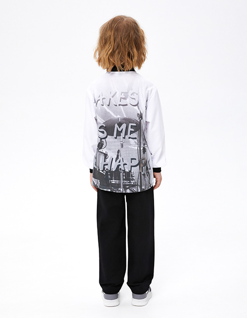 Рубашка для мальчика. Модель прямого силуэта. Воротник отложной, сзади - стойка из эластичной рибаны. Комфортная застёжка на кнопки. Манжеты из рибаны. Накладной карман. Рубашка декорирована авторскими цифровыми и трансферными печатями. Акцентная спинка.