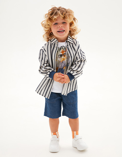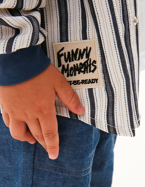 Дизайнерская рубашка из поплина в полоску для мальчика. Модель прямого объёмного силуэта. Спущенная линия плеча. Отложной воротник сзади переходит в стойку из рибаны. Мягкие эластичные манжеты. Комфортная застёжка на кнопки. Рукотворная авторская лэйба.