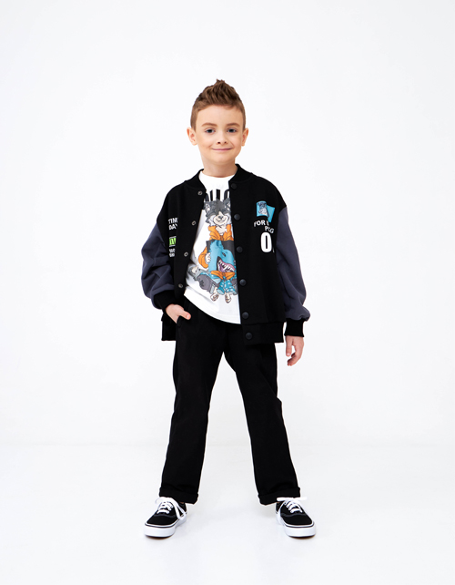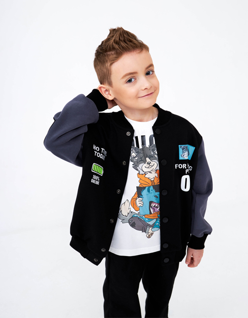 Стильный чёрный бомбер для мальчика. Прямая объёмная модель с контрастными рукавами. Воротник-стойка и низ изделия из рибаны. Бомбер на удобных кнопках. Изделие декорировано вышивкой с аппликацией.