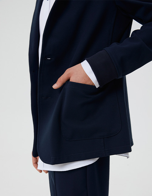 Классический пиджак тёмно-синего оттенка для мальчика. Модель прямого силуэта. Застёгивается на пуговицы. Верхняя часть воротника и манжеты из рибаны. Накладные карманы. Деликатный скрытый авторский декор.