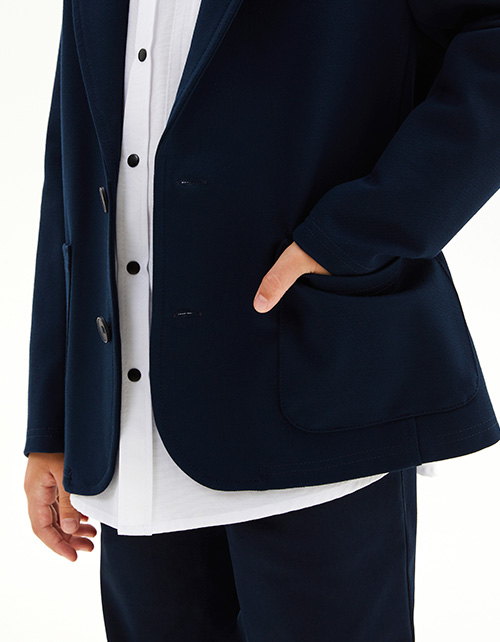 Классический пиджак тёмно-синего цвета для мальчика. Модель прямого силуэта. Застёгивается на пуговицы. Накладные карманы. Деликатный скрытый авторский декор.