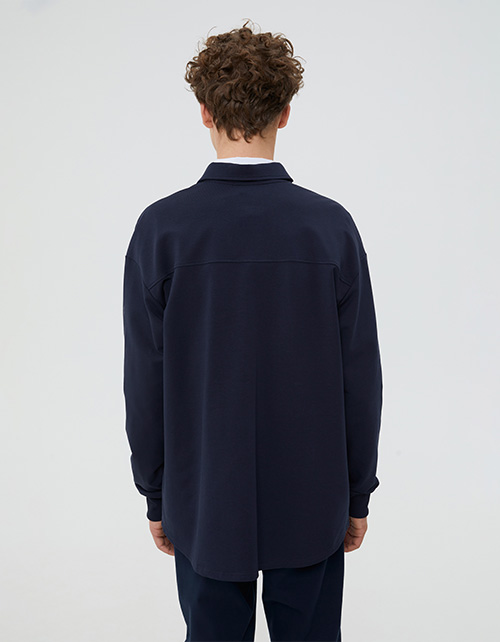 Тёмно-синий школьный жакет-рубашка для мальчика. Модель прямого силуэта, оверсайз. Спущенная линия плеча. Накладной карман с клапаном. Комфортная застёжка на кнопки. Манжеты из рибаны. Деликатный авторский принт на рукаве.