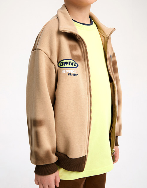 Стильный жакет благородного бежевого оттенка для мальчика. Комфортная прямая объёмная модель. Приспущенная линия плеча. Манжеты и низ изделия из мягкой эластичной рибаны. Комфортная застёжка на молнию. Изделие декорировано авторскими принтами и вышивкой.