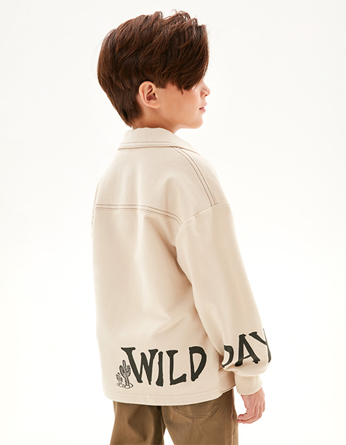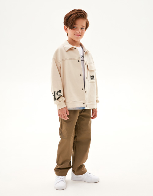 Трендовый жакет-джуда оттенка экрю для мальчика. Прямая объёмная модель. Спущенная линия плеча. Мягкие эластичные манжеты. Накладной карман декорирован вышивкой. Комфортная застёжка на кнопки. Комбинация материалов: твил и тактильно приятный футер.