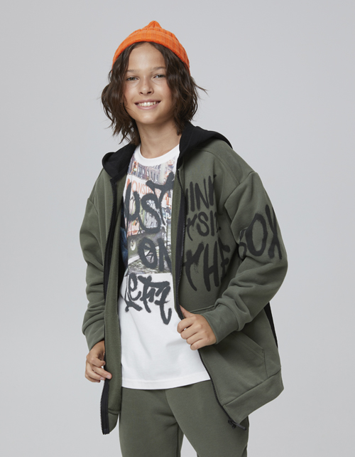 Трендовый жакет-худи для мальчика. Модель прямого объёмного силуэта. Изделие с контрастными молнией и капюшоном. Накладной карман-кенгуру. Жакет из футера с браш-эффектом и спинкой из твила. Декорирован авторским принтом в стиле граффити.