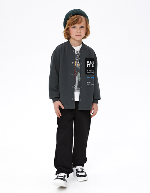 Базовый жакет-рубашка оттенка тёмный лес для мальчика. Модель расслабленного силуэта. Приспущенная линия плеча. Воротник-стойка и манжеты из эластичной рибаны. Комфортная застёжка на кнопки. Рубашка дополнена накладным карманом из твила. Авторский декор.