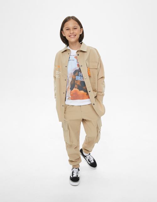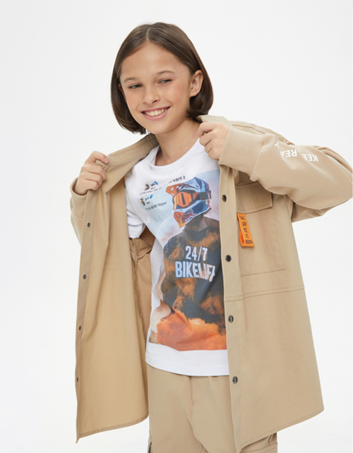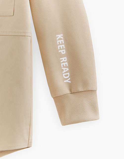Бежевый жакет-рубашка для мальчика. Модель прямого силуэта с мягкими манжетами на рукавах. Изделие из комбинированного материала (твил + футер) с браш-эффектом, что делает его мягким и износостойким.